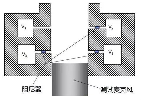 耳模拟器主要由4个小管腔和1个大管腔组成,每个小管腔的体积约为0.1cc-0.22cc(图中V1、V2、V3、V4),通过一根细管与大管腔相连,其中三个小管腔还设有阻尼(图中V2、V3、V4)。